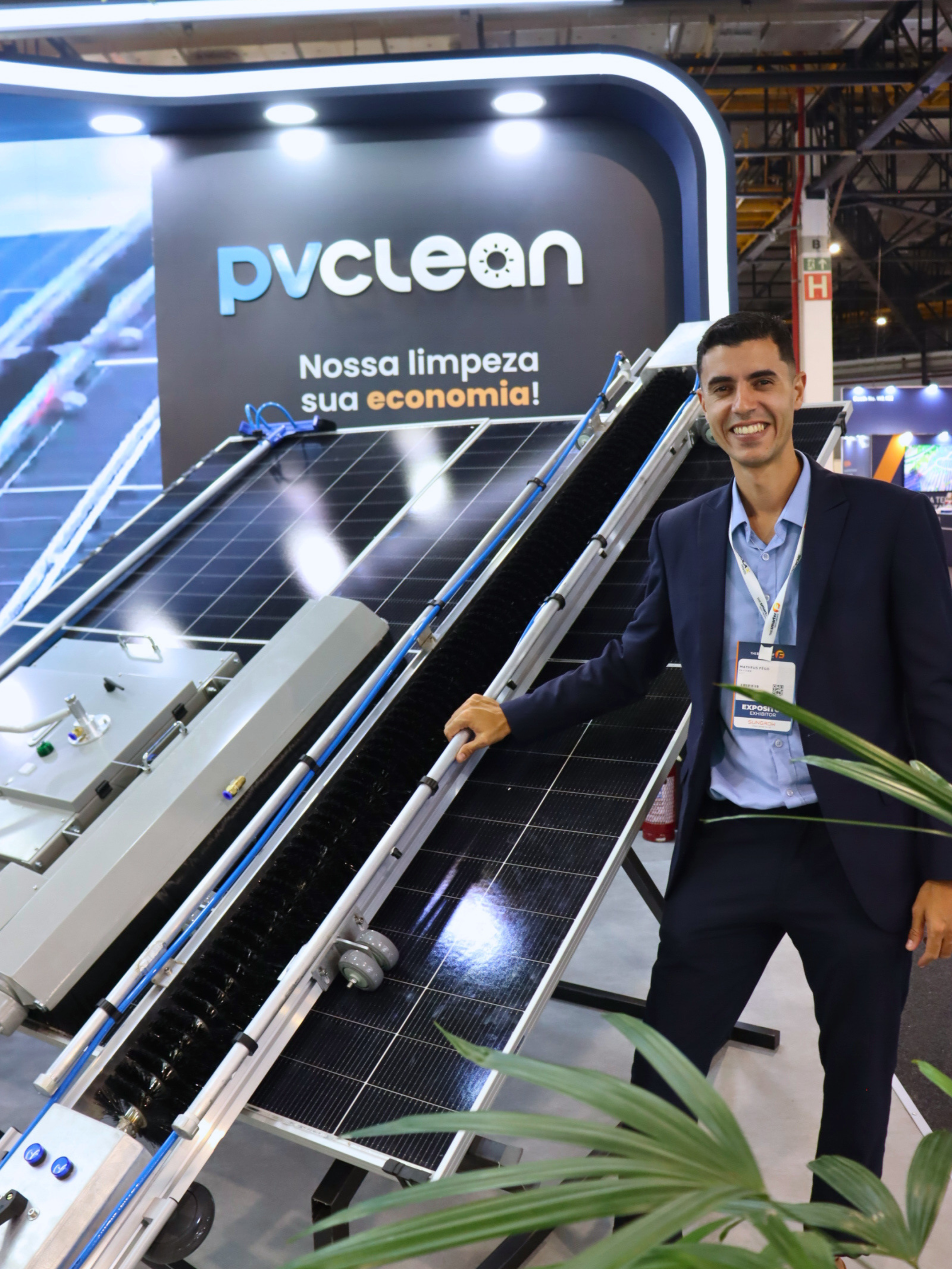 Matheus Pêgo, CEO da PV Clean, apresenta novo modelo de robô de limpeza na Intersolar 2025.