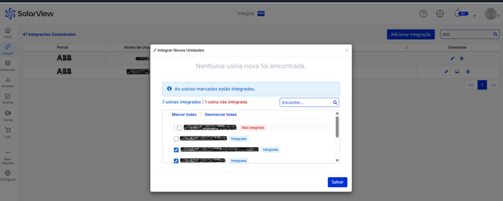 Vai ser apresentado uma lista de usinas encontradas na integração que serão exibidas na Visão Geral