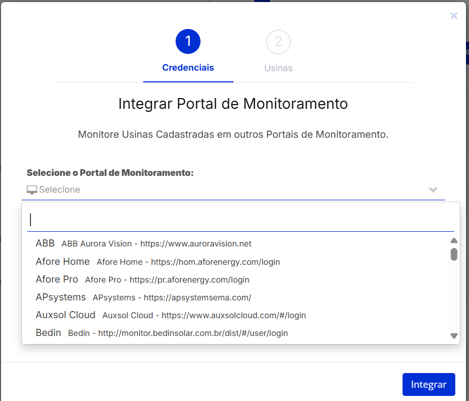 OBS: alguns fabricantes possuem vários portais diferentes de acesso ao monitoramento, por isso confirme se o portal selecionado é o portal correto de acesso das usinas conferindo pelo link da acesso que aparece ao selecionar o portal