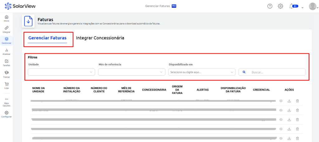 Você pode utilizar filtros para localizar as faturas dos seus clientes, pesquisando o nome da unidade, o mês de referência ou pelo modo que a fatura foi disponibilizada na Solarview ( pelo portal da concessionária ou pelo integrador).