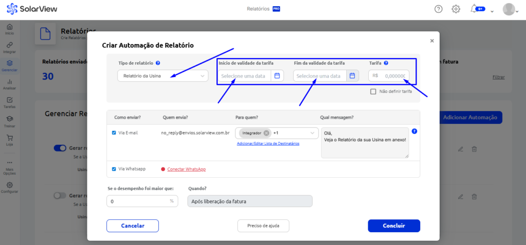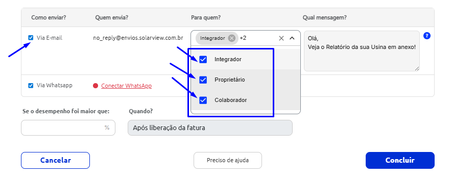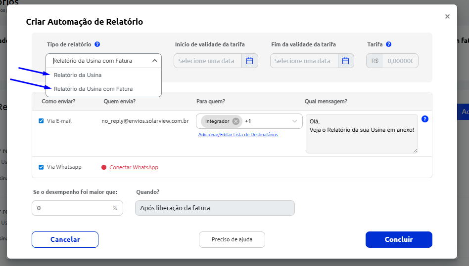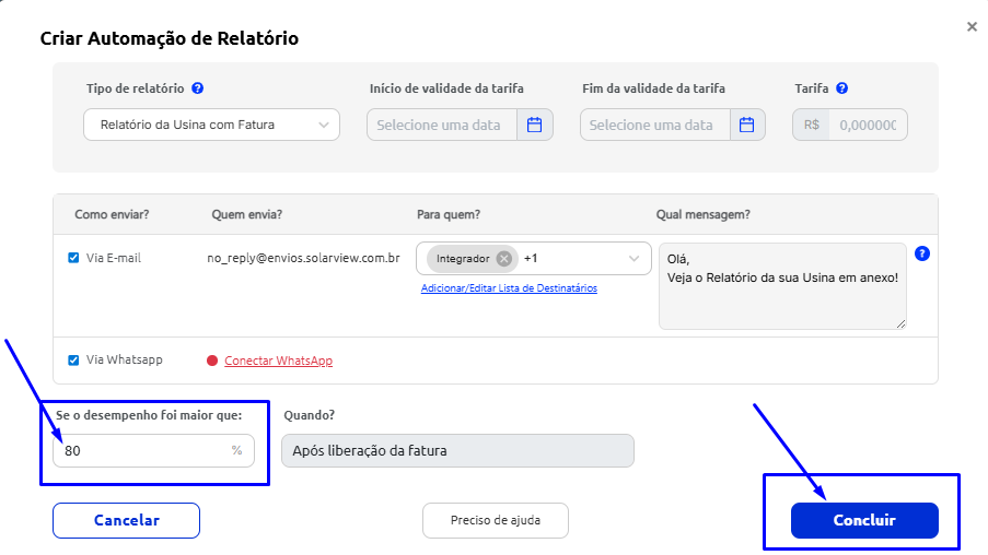 7 – Defina a porcentagem de desempenho que as usinas precisam atingir para o relatório ser gerado e enviado automaticamente e clique em “Concluir” :