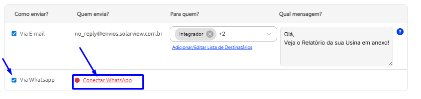 Selecione o tipo de envio via Whatsapp, em seguida clique em “conectar Whatsapp” para configurar a automação e os relatórios serem enviados através do contato da sua empresa.