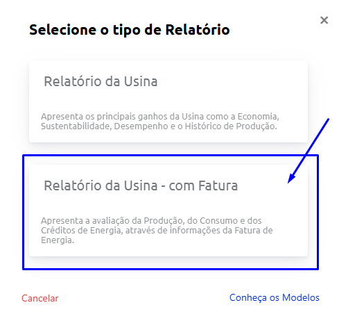 Nessa página clique em “Criar relatório”, em seguida clique em “Relatório da Usina – com fatura”.