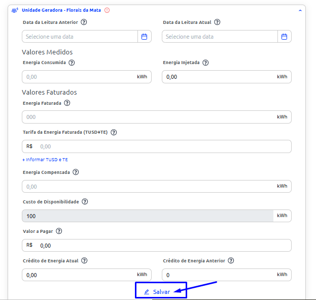 Preencha as informações de medição da fatura de energia da unidade, para isso clique em ‘Adicionar dados manualmente’. Após preencher todos os dados clique em ‘Salvar’.