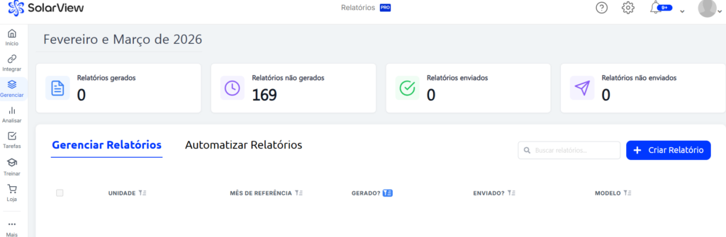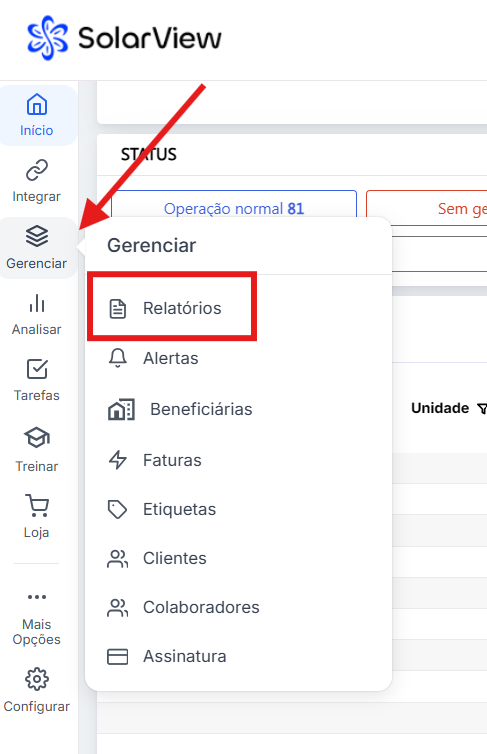 • 1) Acesse e faça login na Central de Monitoramento SolarView (https://my.solarview.com.br/), abra o Menu esquerdo na opção “GERENCIAR” depois clique em “RELATÓRIOS”.