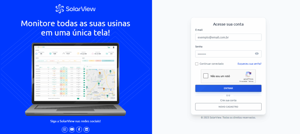 1º) Acesse sua conta de integrador SolarView pelo site https://my.solarview.com.br;