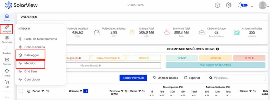 2°) Na Visão Geral, clique no menu “integrar” em seguida e “Datalogger/Medidor”