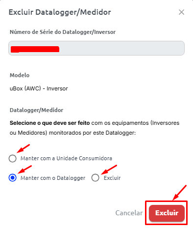 5º: Após selecionar a opção “excluir”, Os dados do datalogger poderão ser operados de 3 formas: Permanecer com unidade consumidora, Permanecer com datalogger ou Serem excluídos.