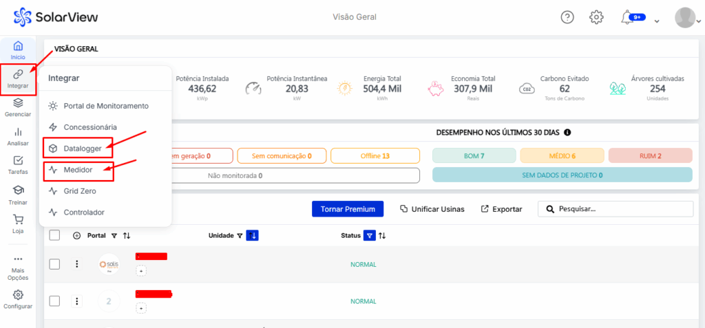 - Acesse Menu >> Integrar >> Datalogger/Medidor