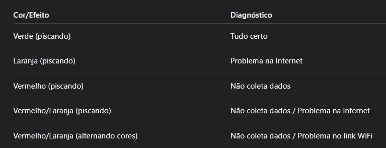 Tabela de Status do LED (Válido apenas quando o Datalogger está em ‘Modo Coleta’). Durante os 5 primeiros minutos do modo ‘Configuração’, o LED alterna entre vermelho e laranja.