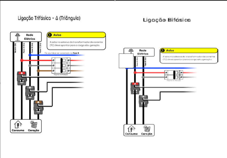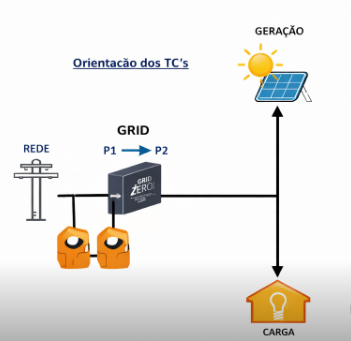 - Sentido do TC da rede para carga (se o circuito monitorado for rede elétrica). Veja o passo 1 Instalar (logo acima).