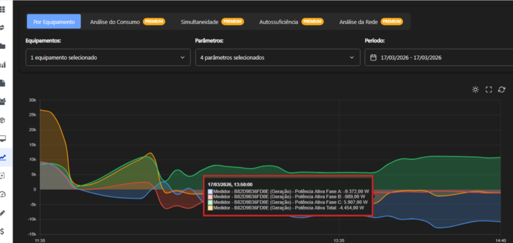- Verifique também o comportamento em: Parâmetros: “Potencia Fase A (W)”, “Potencia Fase B (W)” e “Potencia Fase C (W)”;