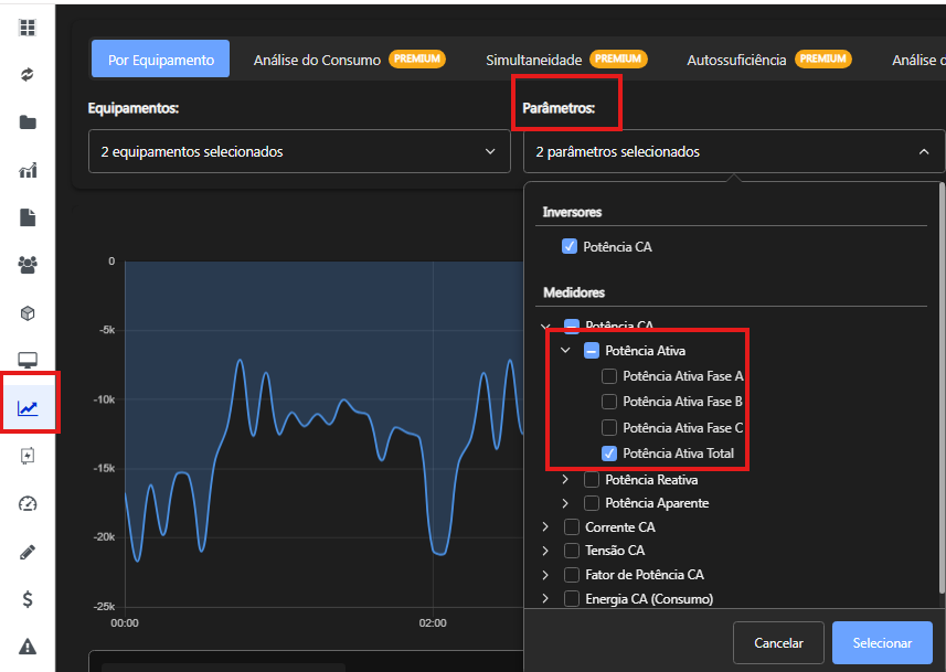 - Selecione em: Parâmetros: “Potencia Ativa Total (W)”;