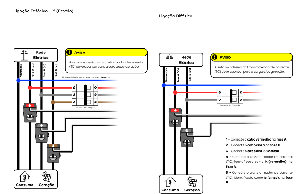- Em caso de Circuito Delta, com Fase-Neutro em 220V, É NECESSARIO ULTILIZAR TRANSFORMADOR REBAIXADOR DE TENSÃO, ou adquirir o Smart Meter GridZero.