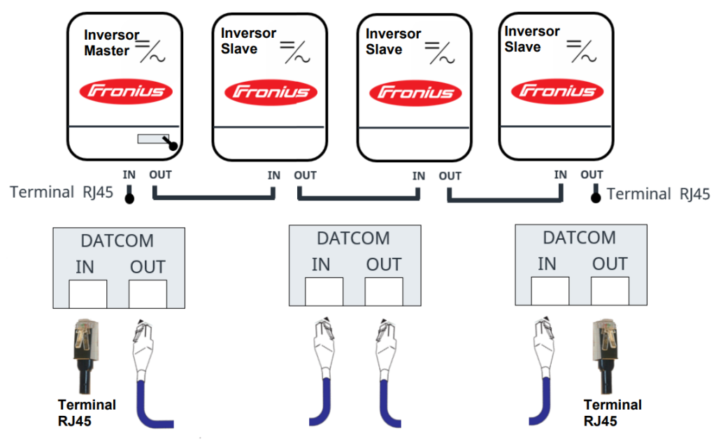 2- Para fazer a conexão do medidor aos Inversores Fronius, é necessário ter a presença da placa de comunicação “Datamanager 2.0”. Conecte a placa interna de comunicação no seu inversor e configure ela como “Master”.