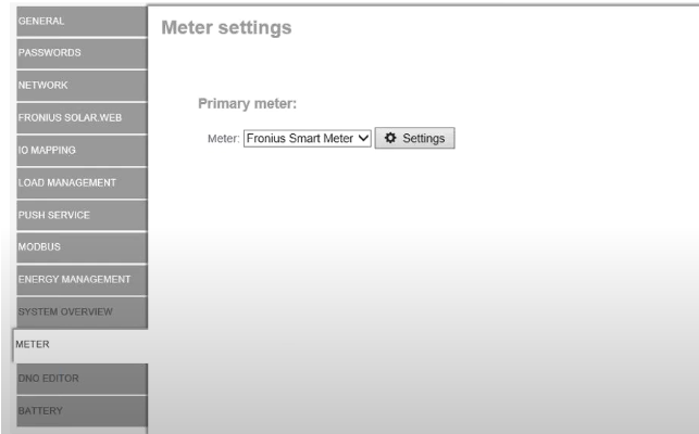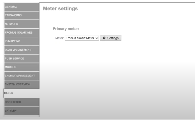 3- Em Primary Meter, selecione “Fronius Smart Meter”, e clique em Settings. Configure a localização do medidor no ponto de rede “Feed-in point”.
