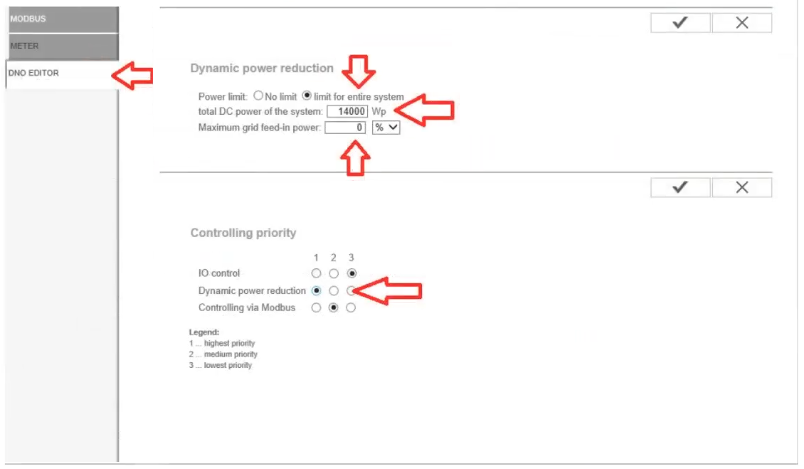 4- No menu lateral, clique na opção DNO Editor, selecione a opção “Limit for entire System”, adicione o valor total de Potência da Geração do sistema em Wp. E por fim adicione o valor máximo de potência a ser exportada. Para a função grid zero, selecione “0W” ou “0%”. Finalize clicando no botão de confirmar. Por fim, defina a prioridade do controle conforme está na imagem a seguir.