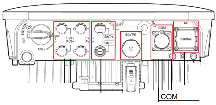 3- Na face inferior do inversor abra a porta “COM”.