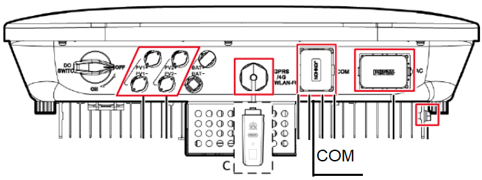 3- Na face inferior do inversor abra a porta “COM”.