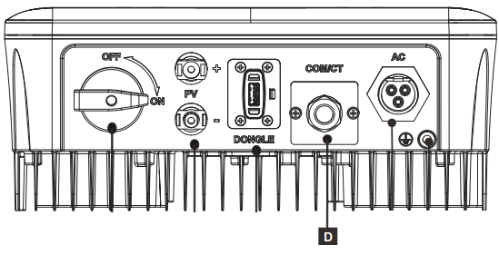 3-  Na face inferior do inversor abra a porta “RS485”, sinalizada pelo item D