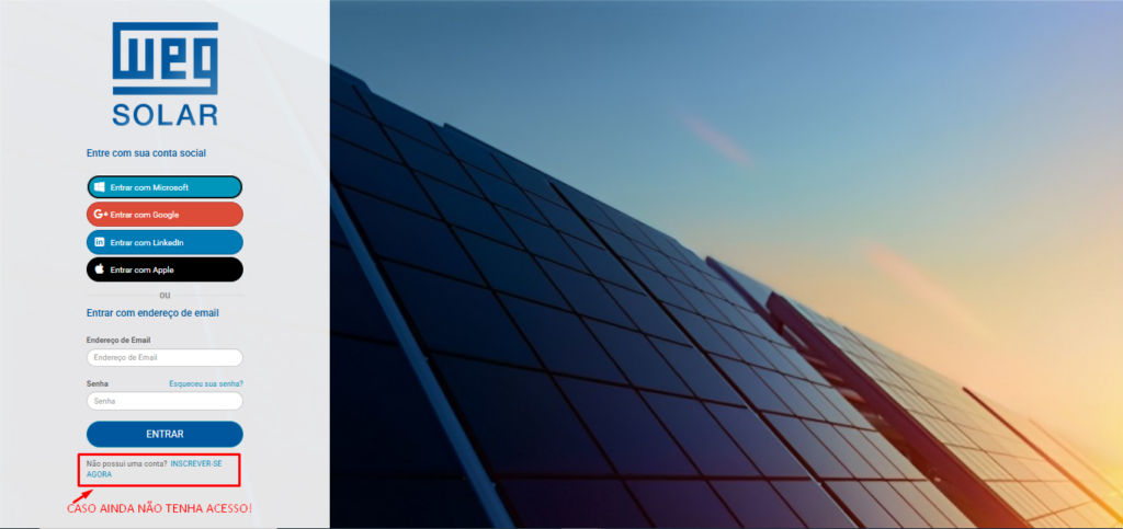 1.1 Acesse o WEG Solar Portal https://solarportal.weg.net/ com seu usuário e senha.