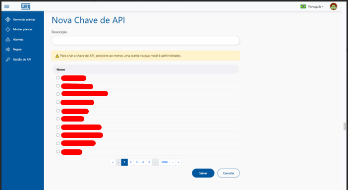 Observação: Apenas plantas nas quais o usuário logado possui perfil de administrador estarão disponíveis para seleção.