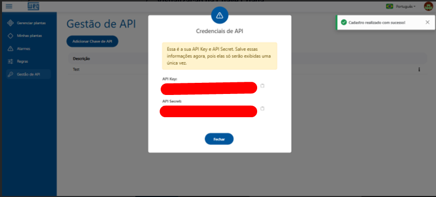 ❗⚠ Importante: As informações da chave serão exibidas somente uma vez. Certifique-se de copiá-las e armazená-las com segurança. Não será possível recuperar o API Secret posteriormente.⚠❗