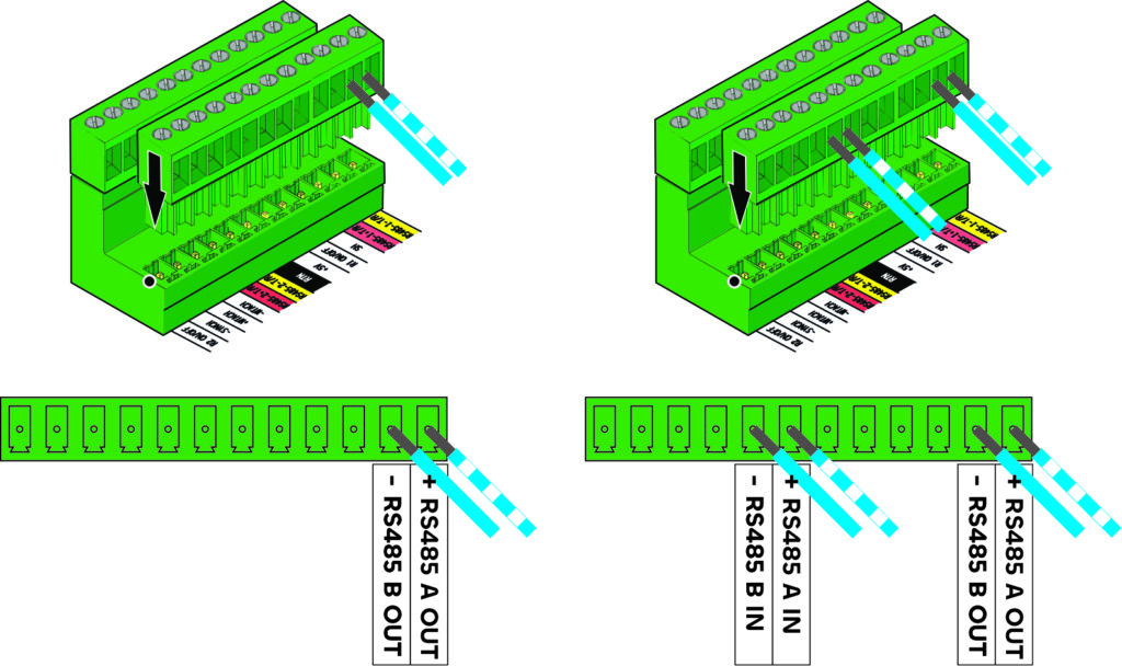 6.1 Para comunicação com um único inversor, as imagens da esquerda exemplificam a crimpagem. Para uma conexão com multi inversor, as imagens da direita exemplificam a crimpagem. Para uma comunicação entre inversores numa solução que utilize esse modelo, é necessario realizar o metodo de conexão “Daisy Chain”.