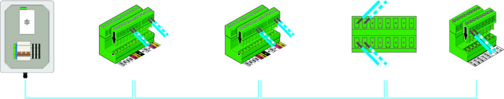 7- Após identificar qual o borne de comunicação do seu inversor, faça a conexão da cascata de inversores, seguindo a crimpagem dos inversores. Segue exemplo de uma instalação com 4 inversores: